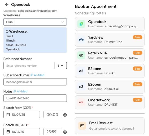 That submission is sent directly to the scheduling platform you’re using, and when the confirmation email arrives, it’s automatically saved in your TMS. There’s no copying, no manual uploads, no wasted time.